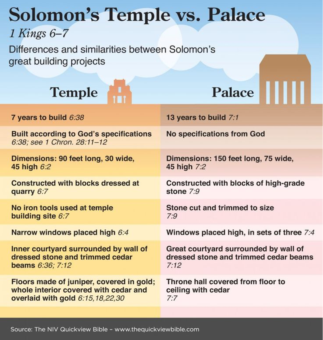 雖然所羅門用了七年的時間來建聖殿,卻用了13年的時間來興建自己的宮殿。但我認為這不一定是反映出他看重自己的宮殿多於神的聖殿。