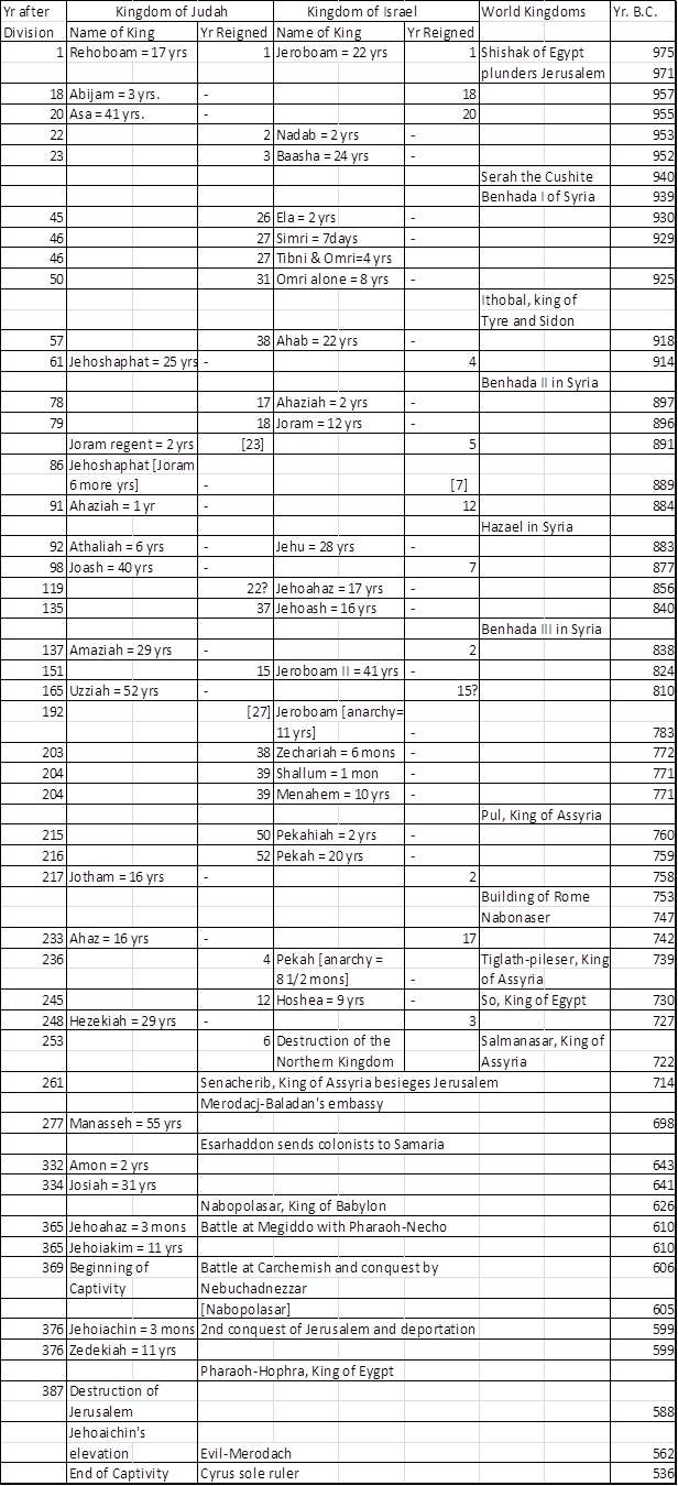 分國的時期:由這段開始,一直到列王紀下的結束,請用以下的圖表作參考: